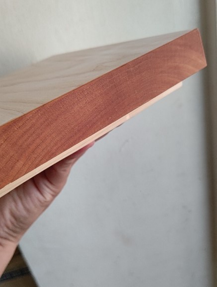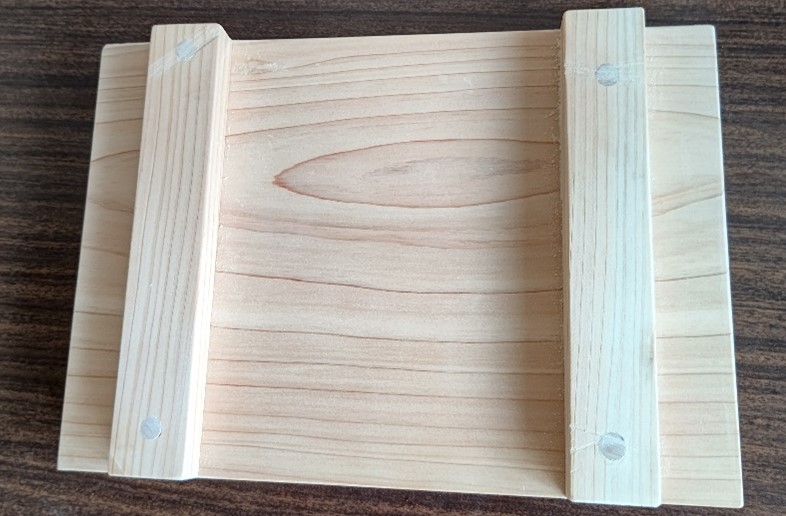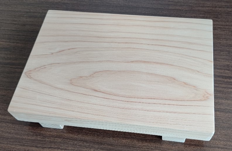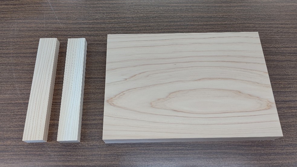 材料:ヒノキ材 22cm×14cm×2.5㎝(天板)、14cm×3cm×1.5㎝(足)