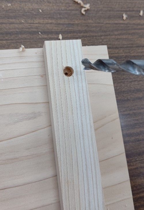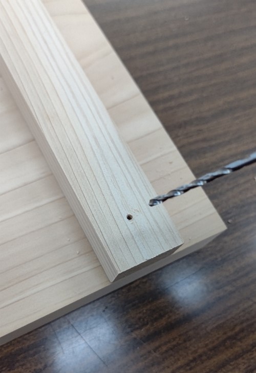 まずは固定位置を決め、下穴をあけたあと、ねじを隠すために大きめの穴を足の中間まであけます。