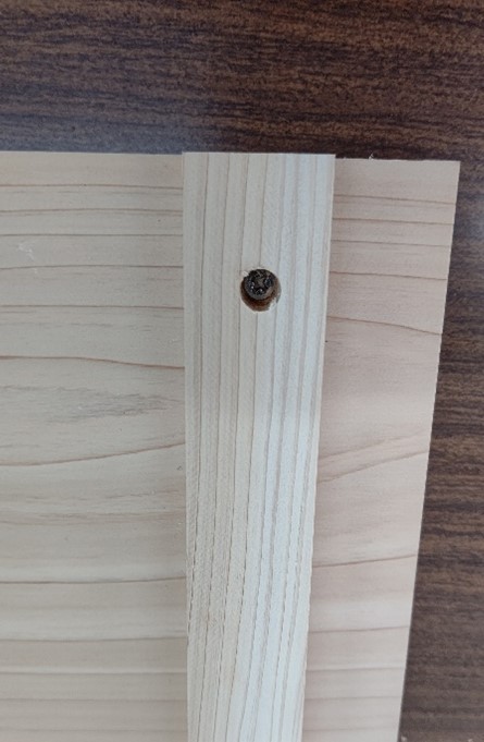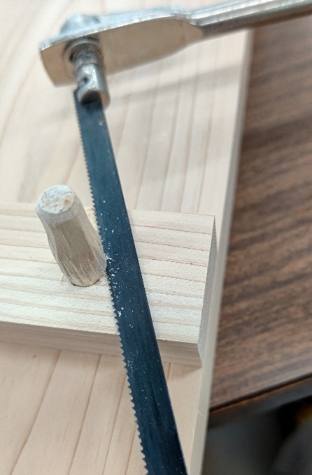 そこへねじを打ち込み、接着剤を入れて木ダボを差し込み、ツライチになるようにカット。