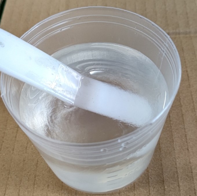 ③2液の境界部分の筋が消えて、全体が透明になるまで混ぜます。