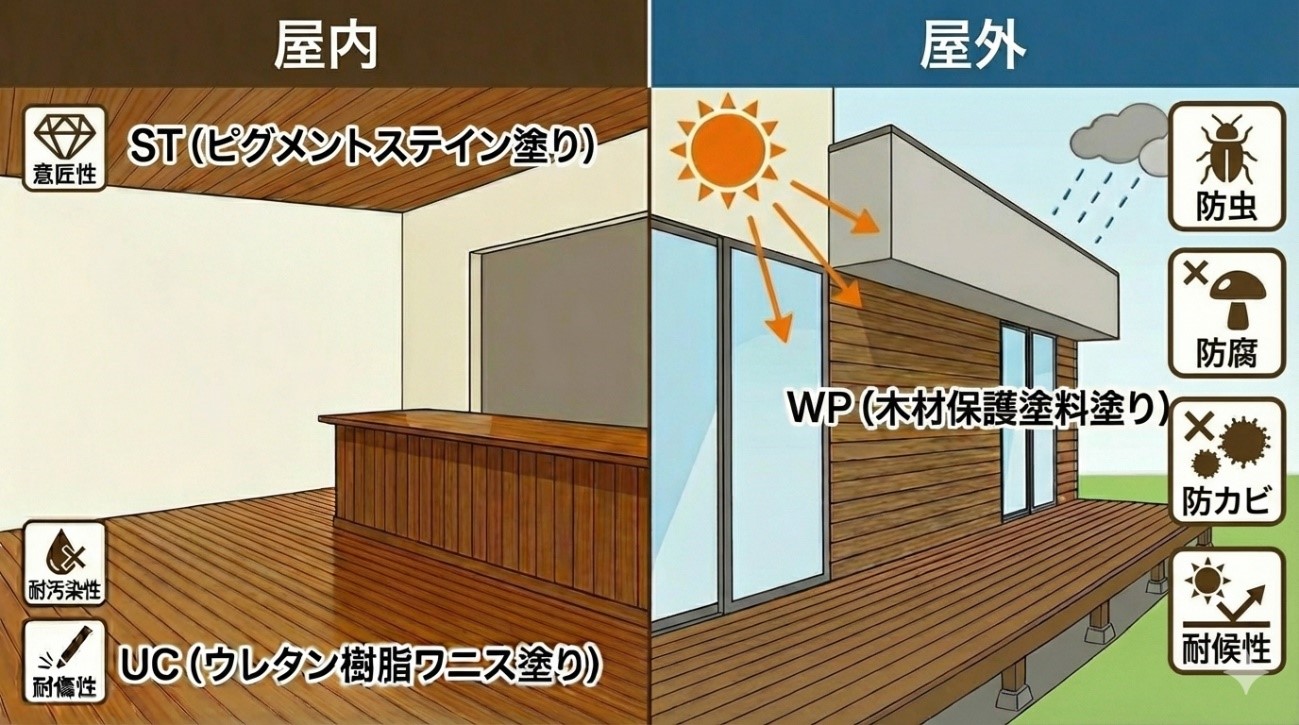 屋内木部塗装のST仕様において、溶剤系と水性系の使い分けは環境配慮の観点から重要な判断となります。