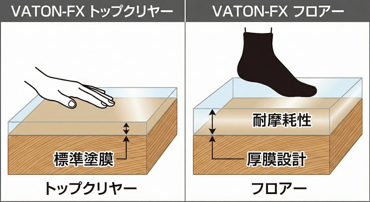 2. 屋内クリヤー塗りの使い分け:VATON-FXトップクリヤー vs VATON-FXフロアー