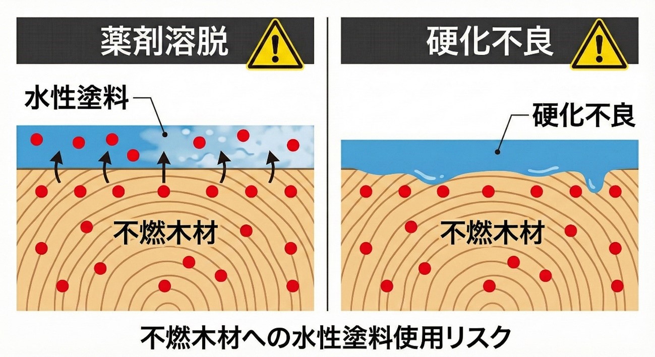 - 薬剤溶脱と硬化不良:特に水性塗料は不燃薬剤の溶脱を促進させやすく、塗料自体の硬化反応にも異常が出ることが多いため、不燃木材への使用はおすすめしません。
