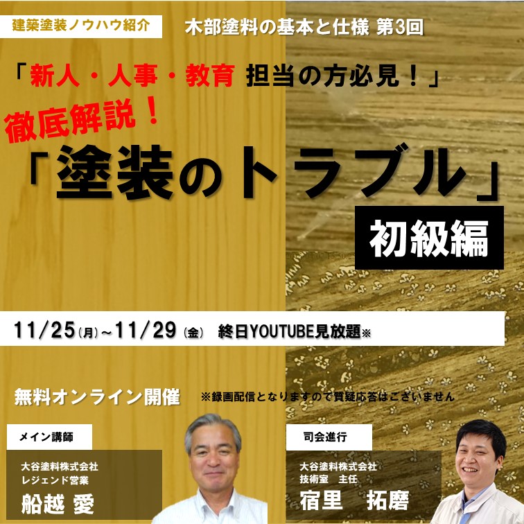 事例・コラム Column 大谷塗料株式会社 木部塗料の基本と仕様第3回「塗装のトラブル 初級編」 木部塗料の基本と仕様第3回「塗装のトラブル 初級編」 2024.11.13 2024年11月25日(月)〜11月29日(金)終日Youtube見放題 カテゴリから情報を探す すべて 屋外木部・ウッドデッキMOKリバ(モクリバ)木製家具・テーブル天板木材保護塗料木製食器オイルステイン浴室・水回り水性塗料食品衛生法適合自然塗料塗装面の滑り止め・防滑(CSR値)公共建築意匠性(塗った感じを出したくない)塗装事例防カビ・防腐・防虫塗装のトラブル塗り替え・メンテナンスSDGs低臭・環境配慮木部塗料の基礎知識木材塗料の耐候性・色あせ施主向け塗装面の傷・汚れ防止コラム塗装面の光沢・艶消し(マット仕上げ)ニュース・イベント等体育館・スポーツ施設木材の不燃・難燃神社仏閣・文化財VATON(バトン)屋内床・フローリングソワードステイン 前の記事へ 次の記事へ 事例・コラム一覧へ