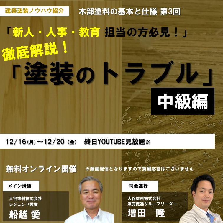 事例・コラム Column 大谷塗料株式会社 木部塗料の基本と仕様第3回「塗装のトラブル 中級編」 木部塗料の基本と仕様第3回「塗装のトラブル 中級編」 2024.12.03 2024年12月16日(月)〜12月20日(金)終日Youtube見放題 カテゴリから情報を探す すべて 屋外木部・ウッドデッキMOKリバ(モクリバ)木製家具・テーブル天板木材保護塗料木製食器オイルステイン浴室・水回り水性塗料食品衛生法適合自然塗料塗装面の滑り止め・防滑(CSR値)公共建築意匠性(塗った感じを出したくない)塗装事例防カビ・防腐・防虫塗装のトラブル塗り替え・メンテナンスSDGs低臭・環境配慮木部塗料の基礎知識木材塗料の耐候性・色あせ施主向け塗装面の傷・汚れ防止コラム塗装面の光沢・艶消し(マット仕上げ)ニュース・イベント等体育館・スポーツ施設木材の不燃・難燃神社仏閣・文化財VATON(バトン)屋内床・フローリングソワードステイン 前の記事へ 次の記事へ 事例・コラム一覧へ