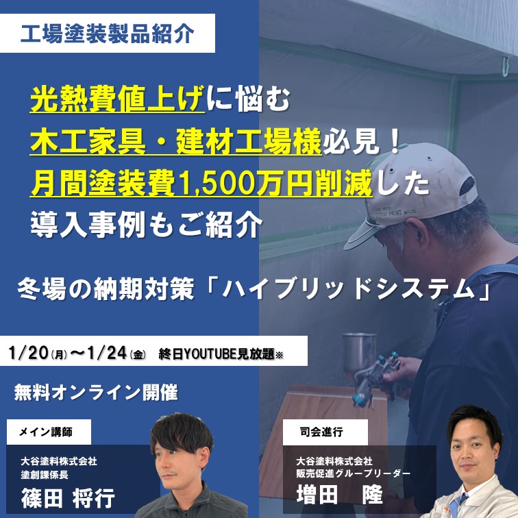 事例・コラム Column 大谷塗料株式会社 冬場の納期対策 ハイブリッドシステム 冬場の納期対策 ハイブリッドシステム 2025.01.08 2025年1月20日(月)〜1月24日(金)終日Youtube見放題 カテゴリから情報を探す すべて 食品衛生法適合自然塗料塗装面の滑り止め・防滑(CSR値)公共建築意匠性(塗った感じを出したくない)塗装事例防カビ・防腐・防虫塗装のトラブル塗り替え・メンテナンスSDGs低臭・環境配慮木部塗料の基礎知識木材塗料の耐候性・色あせ施主向け塗装面の傷・汚れ防止コラム塗装面の光沢・艶消し(マット仕上げ)ニュース・イベント等体育館・スポーツ施設木材の不燃・難燃神社仏閣・文化財VATON(バトン)屋内床・フローリングソワードステイン屋外木部・ウッドデッキMOKリバ(モクリバ)木製家具・テーブル天板木材保護塗料木製食器オイルステイン浴室・水回り水性塗料 前の記事へ 次の記事へ 事例・コラム一覧へ