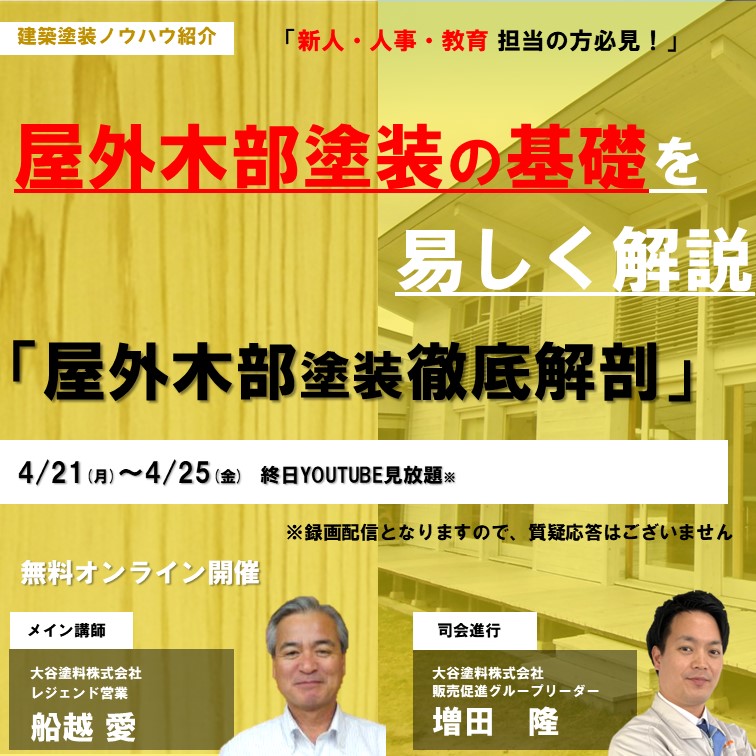 事例・コラム Column 大谷塗料株式会社 屋外木部塗装徹底解剖 屋外木部塗装徹底解剖 2025.04.10 2025年4月21日(月)〜4月25日(金) 終日Youtube見放題 カテゴリから情報を探す すべて 食品衛生法適合自然塗料塗装面の滑り止め・防滑(CSR値)公共建築意匠性(塗った感じを出したくない)塗装事例防カビ・防腐・防虫塗装のトラブル塗り替え・メンテナンスSDGs低臭・環境配慮木部塗料の基礎知識木材塗料の耐候性・色あせ施主向け塗装面の傷・汚れ防止コラム塗装面の光沢・艶消し(マット仕上げ)ニュース・イベント等体育館・スポーツ施設木材の不燃・難燃神社仏閣・文化財VATON(バトン)屋内床・フローリングソワードステイン屋外木部・ウッドデッキMOKリバ(モクリバ)木製家具・テーブル天板木材保護塗料木製食器オイルステイン浴室・水回り水性塗料 前の記事へ 次の記事へ 事例・コラム一覧へ