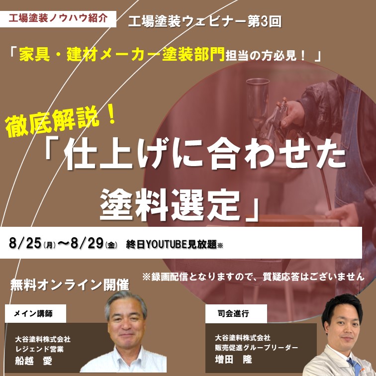 事例・コラム Column 大谷塗料株式会社 工場塗装ウェビナー第3回「仕上げに合わせた塗料選定」 工場塗装ウェビナー第3回「仕上げに合わせた塗料選定」 2025.08.19 2025年8月25日(月)〜8月29日(金) 終日Youtube見放題 カテゴリから情報を探す すべて 塗り替え・メンテナンスSDGs低臭・環境配慮木部塗料の基礎知識木材塗料の耐候性・色あせ施主向け塗装面の傷・汚れ防止コラム塗装面の光沢・艶消し(マット仕上げ)ニュース・イベント等体育館・スポーツ施設木材の不燃・難燃神社仏閣・文化財VATON(バトン)屋内床・フローリングソワードステイン屋外木部・ウッドデッキMOKリバ(モクリバ)木製家具・テーブル天板木材保護塗料木製食器オイルステイン浴室・水回り水性塗料食品衛生法適合自然塗料塗装面の滑り止め・防滑(CSR値)公共建築意匠性(塗った感じを出したくない)塗装事例防カビ・防腐・防虫塗装のトラブル 前の記事へ 次の記事へ 事例・コラム一覧へ