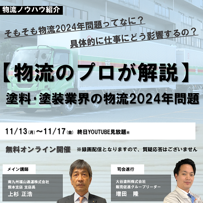 事例・コラム Column 大谷塗料株式会社 【物流のプロが解説】 塗料・塗装業界の 物流2024年問題 【物流のプロが解説】 塗料・塗装業界の 物流2024年問題 2024.02.01 2023年11月13日(月)〜11月17日(金)終日Youtube見放題 カテゴリから情報を探す すべて 屋外木部・ウッドデッキMOKリバ(モクリバ)木製家具・テーブル天板木材保護塗料木製食器オイルステイン浴室・水回り水性塗料食品衛生法適合自然塗料塗装面の滑り止め・防滑(CSR値)公共建築意匠性(塗った感じを出したくない)塗装事例防カビ・防腐・防虫塗装のトラブル塗り替え・メンテナンスSDGs低臭・環境配慮木部塗料の基礎知識木材塗料の耐候性・色あせ施主向け塗装面の傷・汚れ防止コラム塗装面の光沢・艶消し(マット仕上げ)ニュース・イベント等体育館・スポーツ施設木材の不燃・難燃神社仏閣・文化財VATON(バトン)屋内床・フローリングソワードステイン 次の記事へ 事例・コラム一覧へ